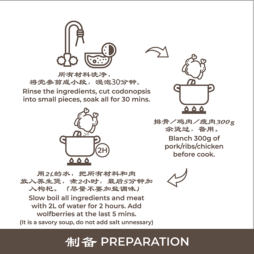 - Slow boil all ingredients and meat with 2L of water for 2 hours. Add wolfberries at the last 5 mins. (It is a savoury soup, do not add salt unnecessary)