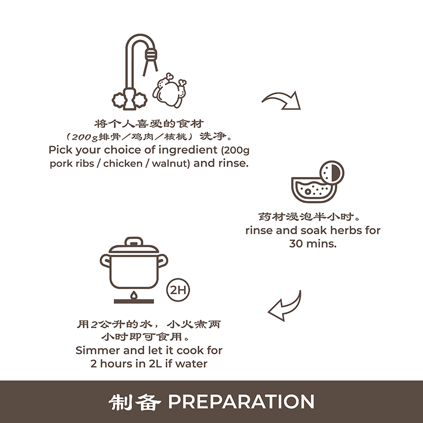 Soak herbs for 1/2 hr. Simmer herbs and 200g of ingredients of your choice for 2 hours in 2L of water.