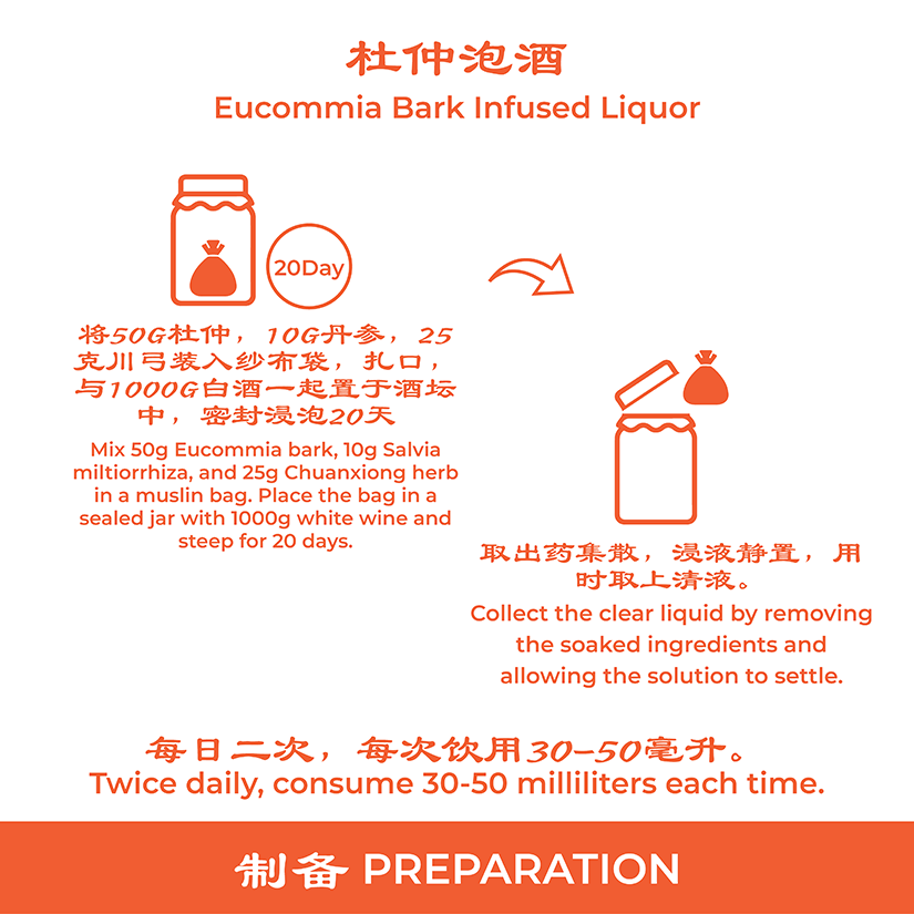 - Eucommia Bark Infused Liquor (Twice daily, consume 30-50 millilitres each time):