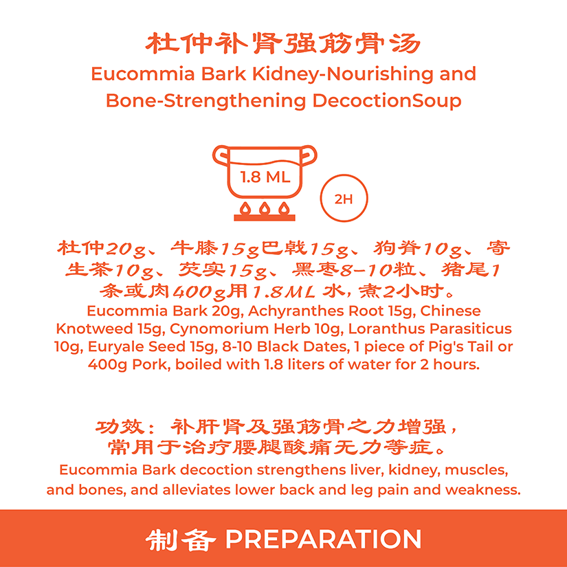- Eucommia Bark Kidney-Nourishing and Bone-Strengthening Decoction Soup( Eucommia Bark decoction strengthens liver, kidney, muscles, and bones, and alleviates lower back and leg pain and weakness.)