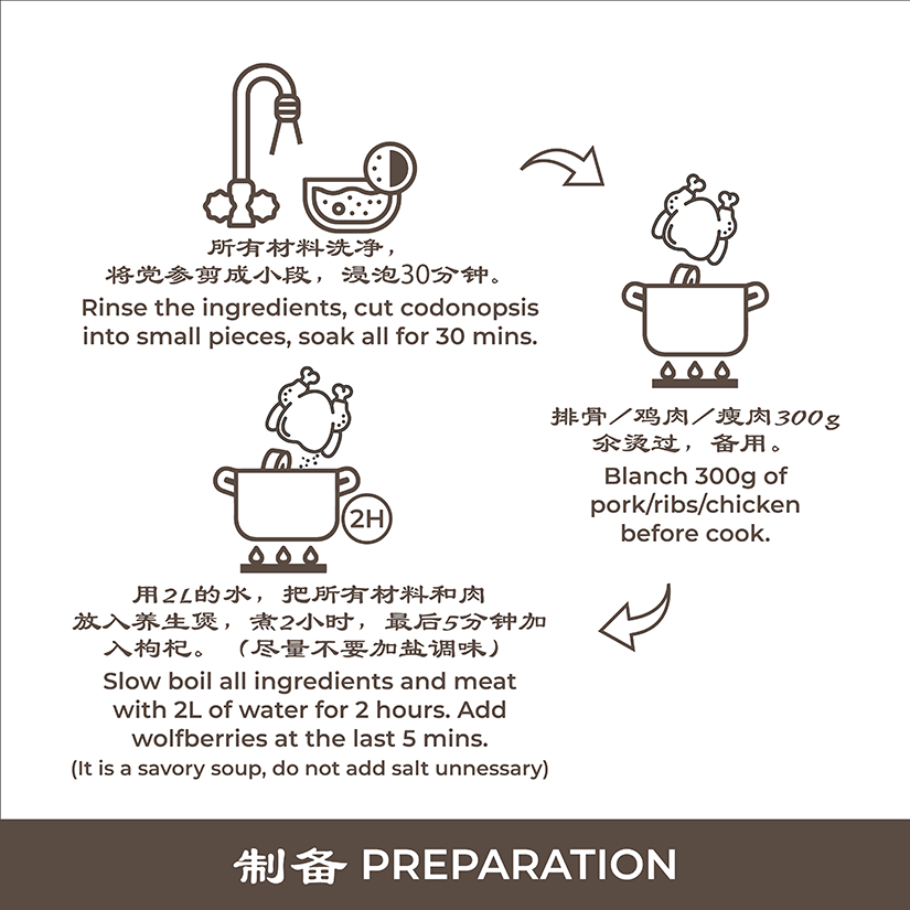 - Slow boil all ingredients and meat with 2L of water for 2 hours. Add wolberries at the last 5 mins.