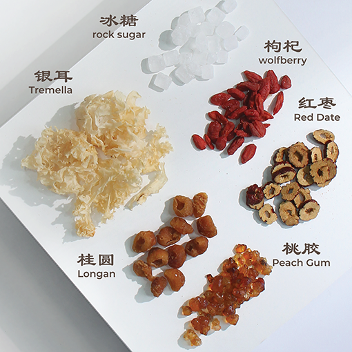 This nourishing dessert soup is made with peach gum, snow fungus, Zhangzhou longan, red dates, goji berries, and rock sugar. Before serving, you may add milk or oat milk for a creamy, rich texture and extra nutrition. Besides promoting radiant skin, it also supports blood nourishment, calming the mind, and improving sleep quality.