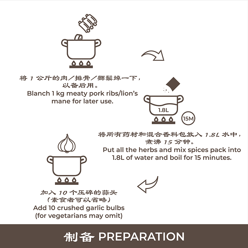 - Put all the herbs and mix spices pack into 1.8L of water and boil for 15 minutes.