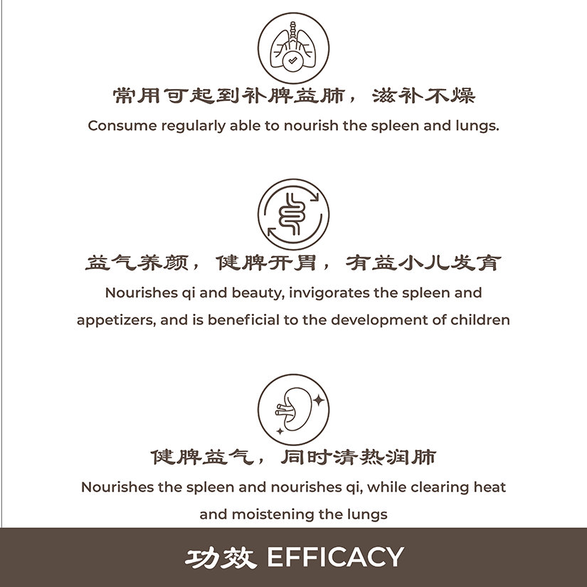 - Nourishes the spleen and nourishes Qi, while clearing heat and moistening the lung.