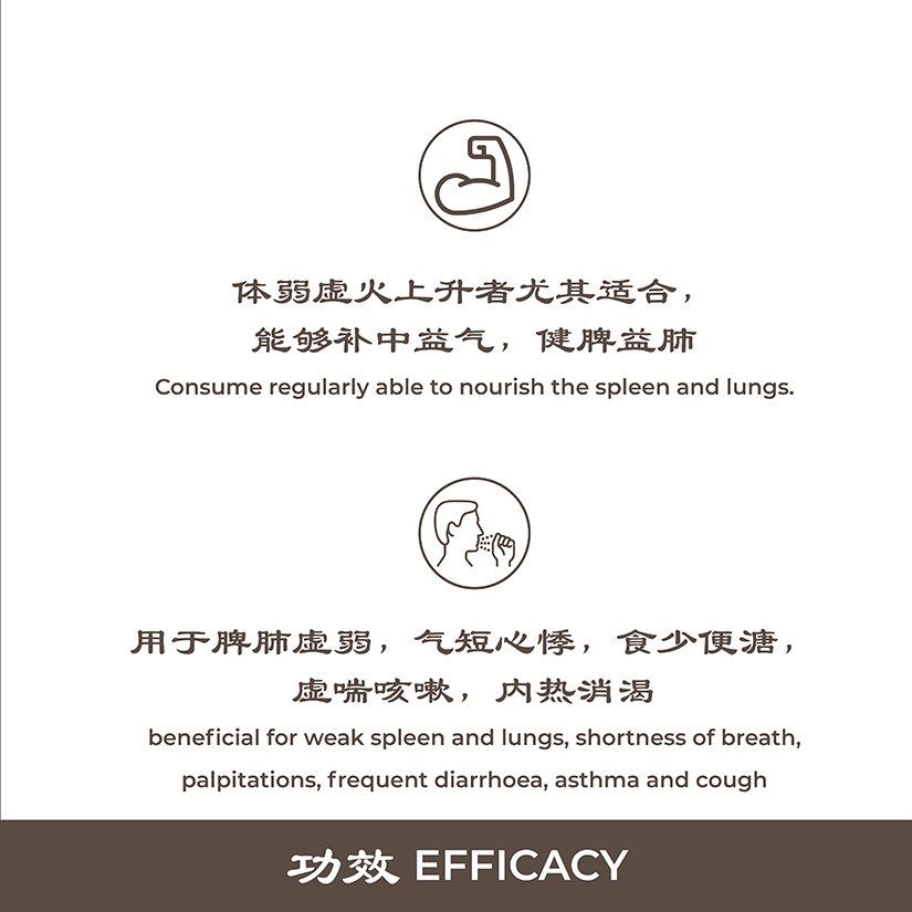 - beneficial for weak spleen and lungs, shortness of breath palpitations, frequent diarrhoea, asthma and cough