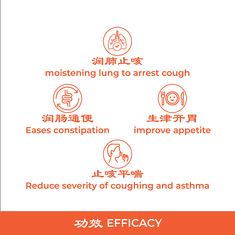 功效:润肺止咳,缓解便秘,改善饮食,减轻咳嗽和哮喘的严重程度