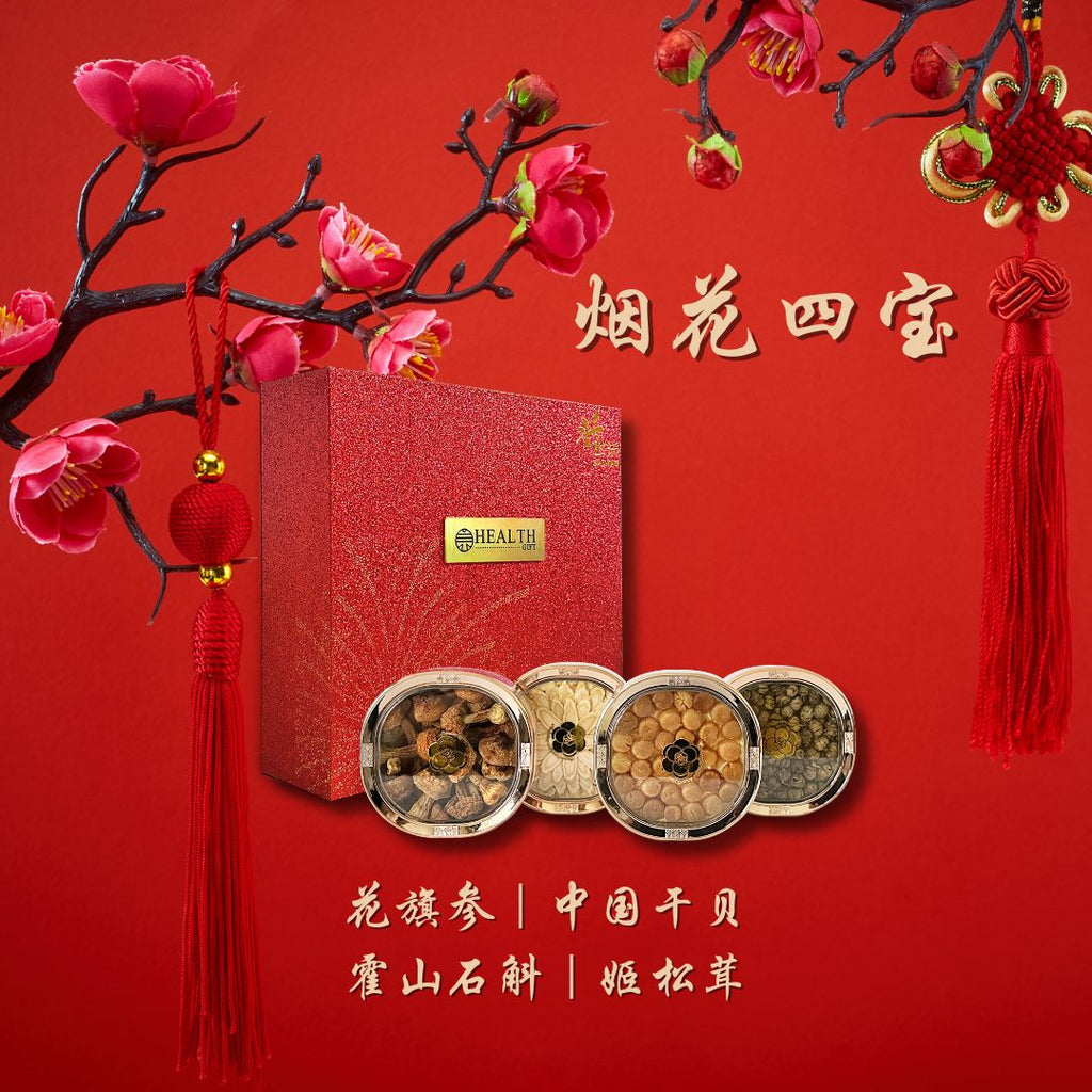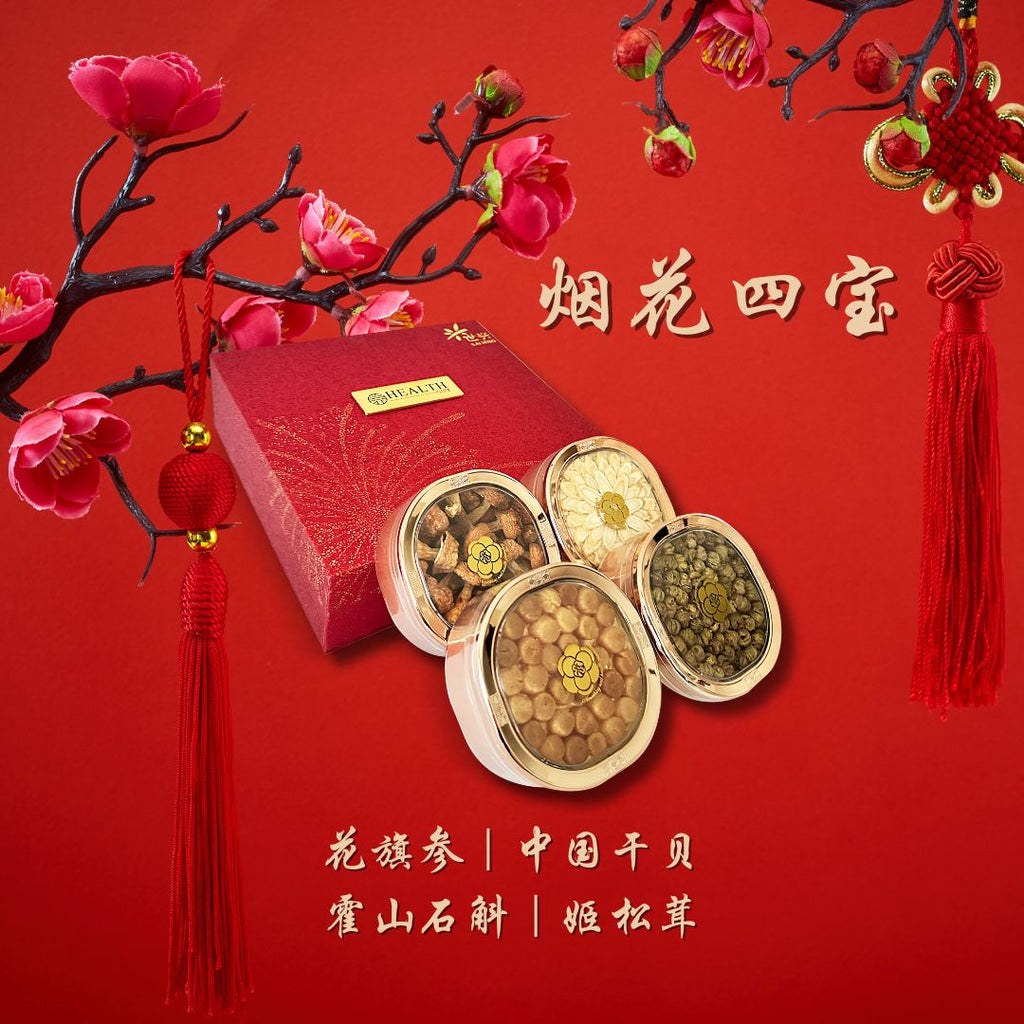 世兴的烟花四宝礼盒荟萃了四种珍贵的优质食材,象征着健康、活力与繁荣。这款奢华礼盒包含: